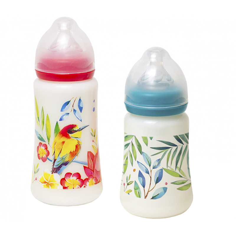 Bērnu pudeles ar platu kaklu no izturīga polipropilēna. Nesatur BPA. Ar antikoliku silikona knupīšiem.