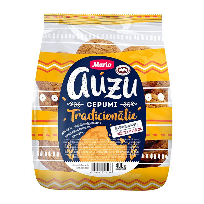 kviešu milti, cukurs, augu tauki (rafinēta šī kodolu eļļa 60%, rafinēta palmu kodolu eļļa 40%), auzu milti (12,02%), ūdens, rozīnes, invertsīrups tumšais (cukurs, ūdens, skābuma regulētāji: citronskābe, amonija hidrogēnkarbonāts, nātrija hidrogēnkarbonāts), miežu iesals, pārtikas sāls, irdinātāji: nātrija hidrogēnkarbonāts, amonija hidrogēnkarbonāts, kanēlis, aromatizētājs vanilīns.