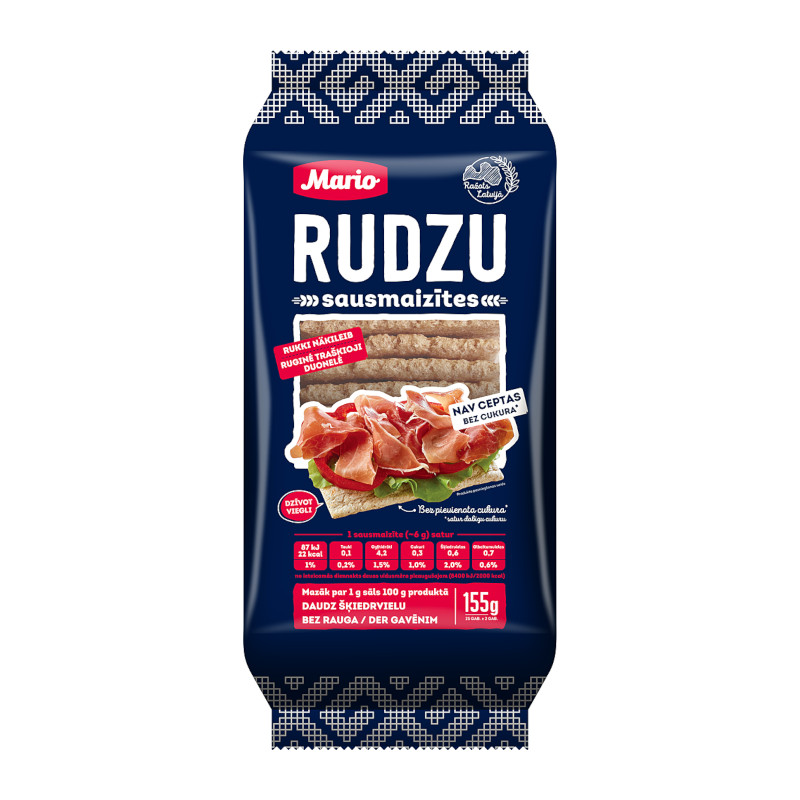 Rudzu milti (49,56%), kviešu milti, kviešu klijas (10%), raudzēts rudzu iesals, sāls. Ražots tikai no augu izcelsmes izejvielām. Produkts var saturēt olas, sojas, zemesriekstu un sezama daļiņas.