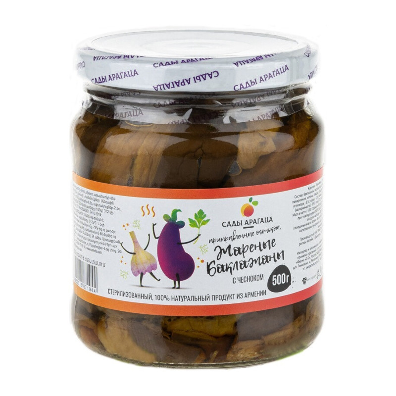 Cepti baklažāni ar ķiplokiem "Сады Арагаца" ir izsmalcināta uzkoda, kas gatavota, izmantojot tikai dabīgas sastāvdaļas. Dārzeņu konservēšana ir izgatavota no baklažāniem un ķiplokiem, pievienojot saulespuķu eļļu, sāli, garšaugus un garšvielas. Konservēto dārzeņu ražošanā ar zīmolu Gardens of Aragats netiek izmantotas krāsvielas, aromatizētāji un konservanti. Pateicoties īpašai tehnoloģiskai apstrādei, tiek saglabātas visas produkta derīgās īpašības. Baklažānu pasniedz kā neatkarīgu uzkodu, kā arī pie dažādiem ēdieniem, tostarp makaroniem un risoto.
