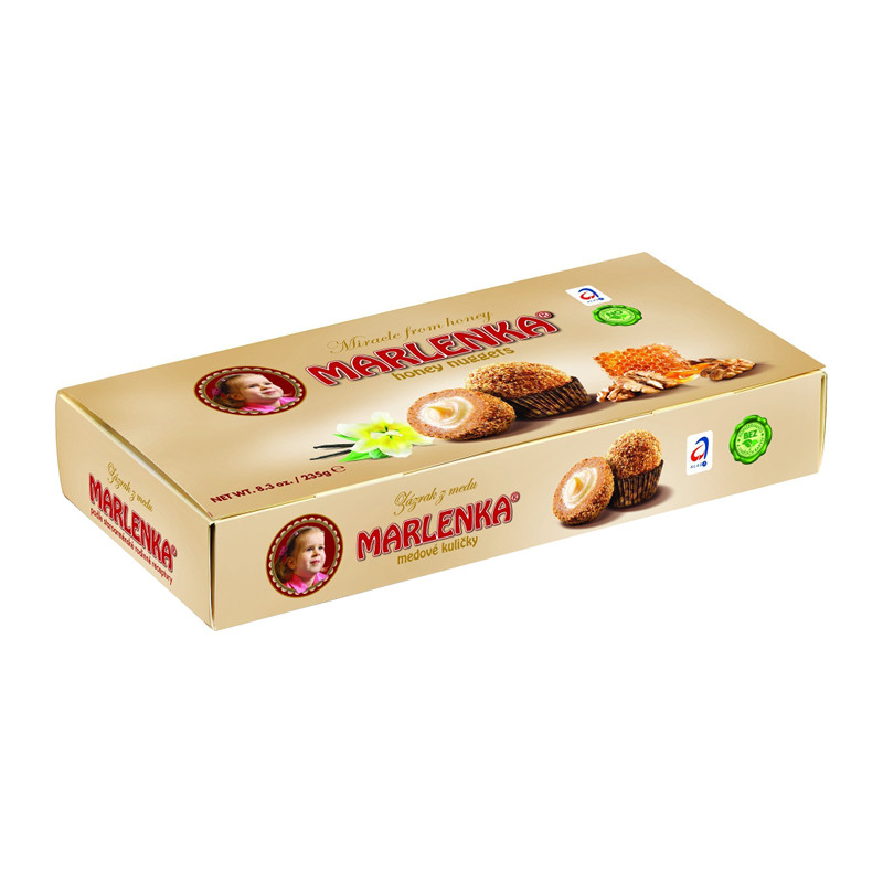 MARLENKA® medus bumbiņas tiek izgatavotas pēc vecās Armēnijas ģimenes receptes no augstākās kvalitātes produktiem, neizmantojot konservantus vai sintētiskas krāsvielas. Par izcilu kvalitāti un ārkārtīgu izturību Čehijas Republikas Zemkopības ministrija piešķīra šim produktam nacionālo KLASA kvalitātes zīmi. Pateicoties unikālajai receptei, kvalitatīvajiem produktiem un iesaiņošanas metodei, MARLENKA® medus bumbiņām ir ārkārtējs glabāšanas laiks. - 90 dienas temperatūrā no 2 ° C līdz 24 ° C - 8 mēnešus, ja to uzglabā temperatūrā līdz 8 ° C - 24 mēneši, sasaldējot līdz -18 ° C